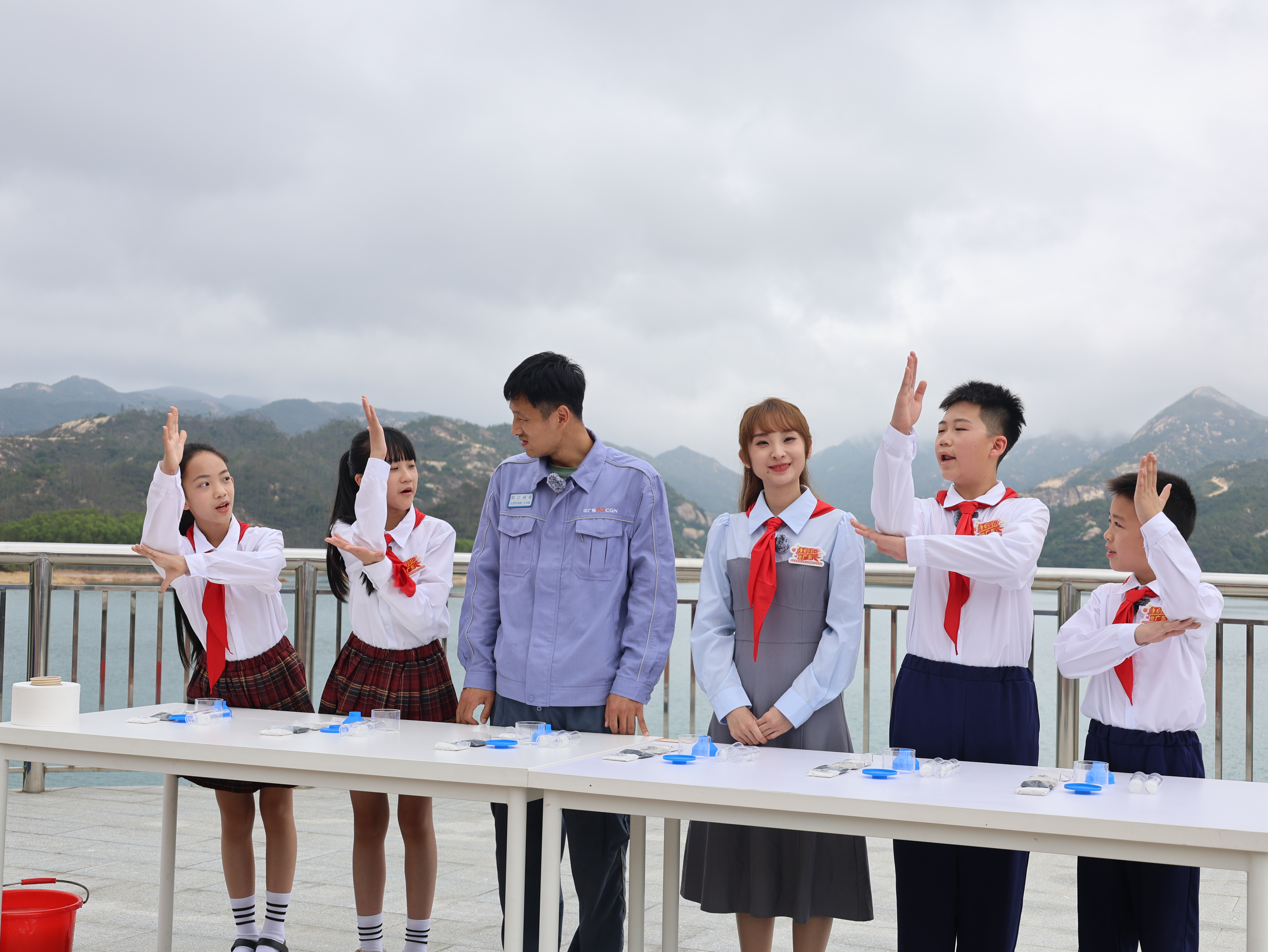 在平堤水庫眺望“綠海豚”,在青山綠水間體驗凈水小實驗,少先隊員切身感受陽江核電“生態(tài)核電”建設(shè)成果。