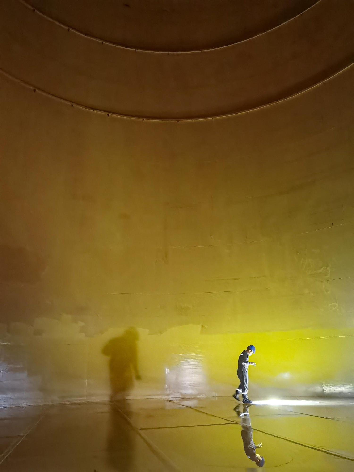 隨著檢查工作的進行,剛轉(zhuǎn)身換個方位檢查的吳文華,無意地將手電筒照向韓建峰。只見認真檢查的韓建峰被照印出兩個身影——積水倒影與身后光影都隨著他向前低頭巡檢,三者在偌大的罐體里交相輝映。