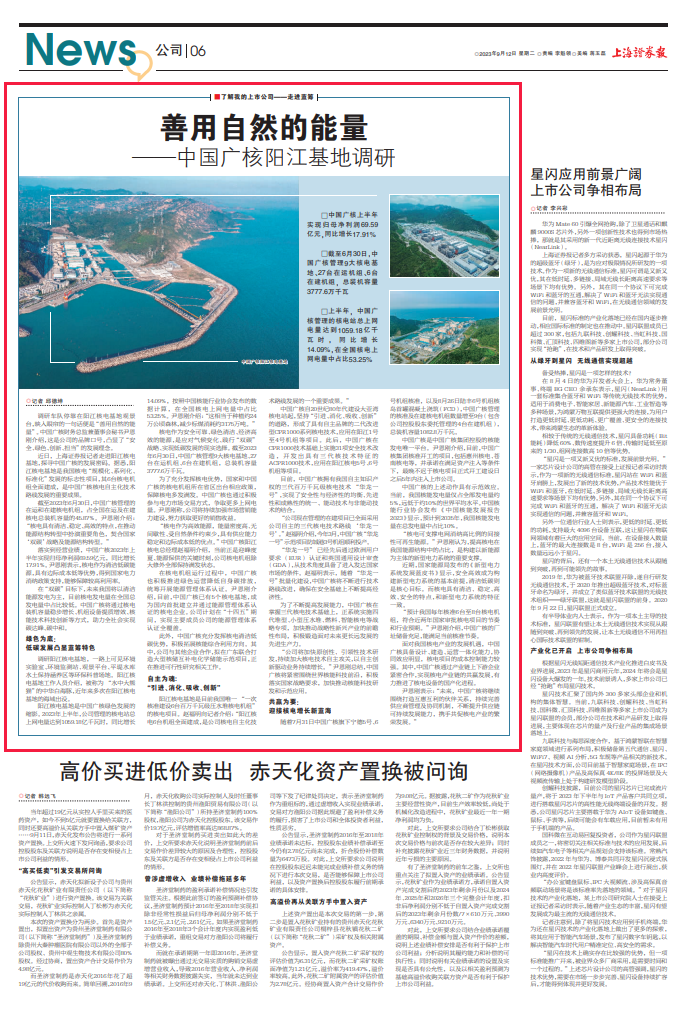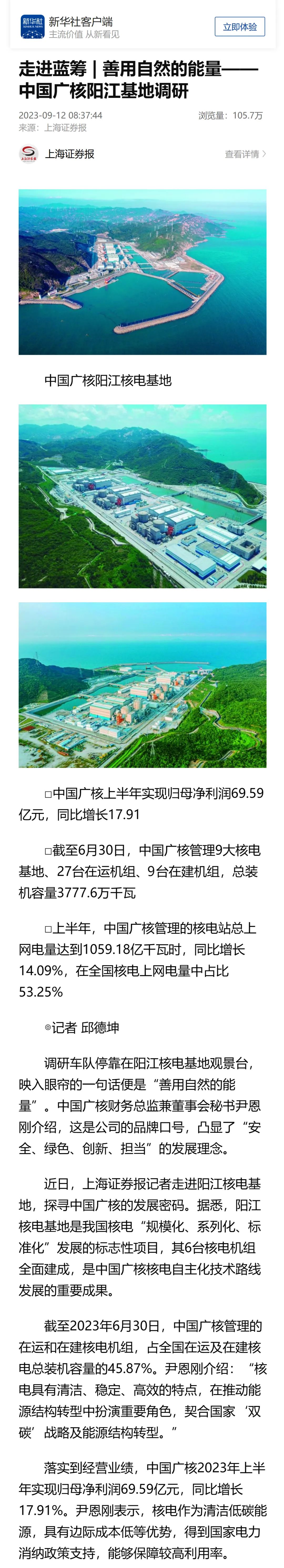 近日,新華社所屬上海證券報(bào)記者走進(jìn)陽江基地,深入探尋中國廣核集團(tuán)的發(fā)展密碼,并刊發(fā)文章《善用自然的能量——中國廣核陽江基地調(diào)研》。
