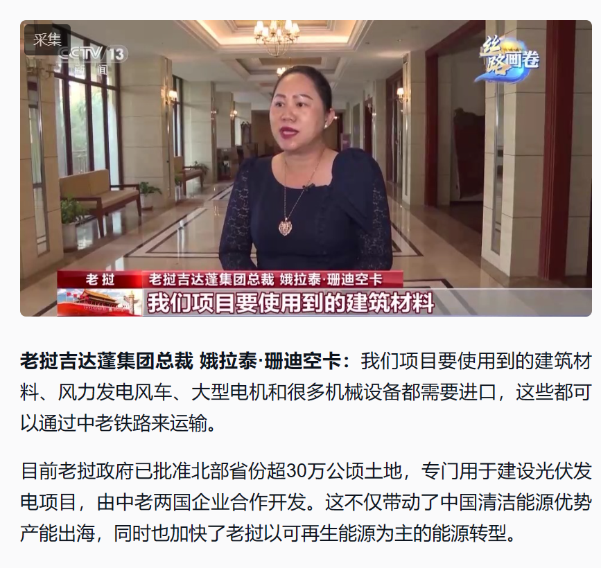 老撾吉達(dá)蓬集團(tuán)總裁 娥拉泰·珊迪空卡:我們項(xiàng)目要使用到的建筑材料、風(fēng)力發(fā)電風(fēng)車(chē)、大型電機(jī)和很多機(jī)械設(shè)備都需要進(jìn)口,這些都可以通過(guò)中老鐵路來(lái)運(yùn)輸。